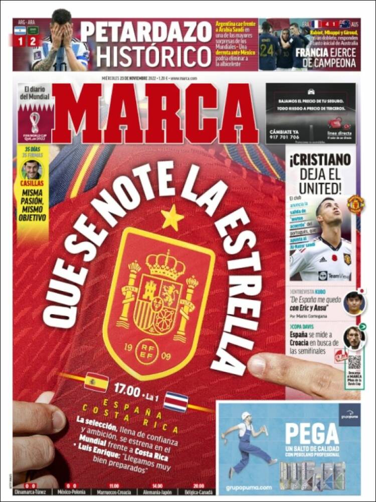 También alude la portada marquista al fin de la relación Cristiano-Manchester United. Nos apena mucho ver a Cristiano acabar su carrera de forma tan turbulenta. La cosa se había puesto imposible desde su entrevista con Piers Morgan, a quien se quejó amargamente por el presunto escaso apoyo de la directiva mancuniana en momentos familiares delicados del astro portugués. A Cristiano le puede el corazón, todo esto nos suena, y reconocemos en esta historia ecos del Cristiano pasional, visceral, que hemos aceptado y hasta querido, como retrospectivamente aceptamos y amamos el espíritu indomable de Di Stéfano. A ver si Cristiano se retira pronto y puede, así, volver a ser eterna y enteramente nuestro. Ya falta un día menos.