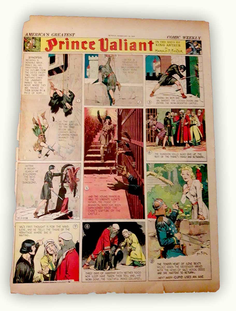 El gran artista canadiense, Harold Foster, que se hizo famoso en los años 30 del pasado siglo gracias a sus historietas sobre Tarzán, publicadas en King Features —propiedad del magnate William Randolph Hearst— creó su célebre personaje del Príncipe Valiente (“Prince Valiant in the Days of King Arthur” fue el título original completo) en febrero de 1937, y durante 1788 semanas, hasta 1971, se publicaron sus tiras de página completa. Uno de los mejores cómics de toda la historia universal, bajo la pluma elegante y estilizada de Foster. Posteriormente a 1971, se siguió publicando, con menos calidad, por otros autores como John Cullen Murphy.