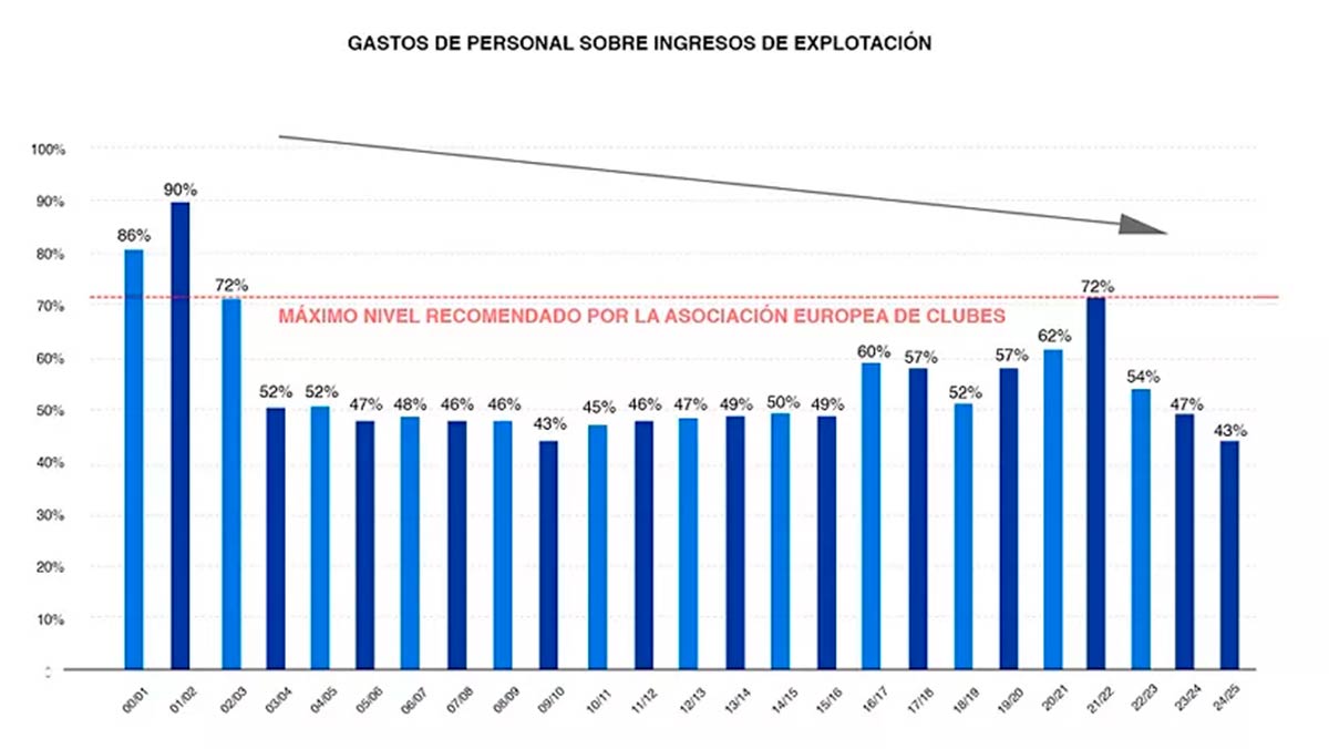 Se encuentra en un 43 %, un 4 % menos que el ejercicio anterior. Un dato bajísimo. De hecho, históricamente es la cifra más baja desde la temporada 2009/2010. Este valor se encuentra muy por debajo del 50 %, umbral considerado de excelencia. Y aun más del 70 %, porcentaje máximo recomendado por la Asociación Europea de Clubes.
