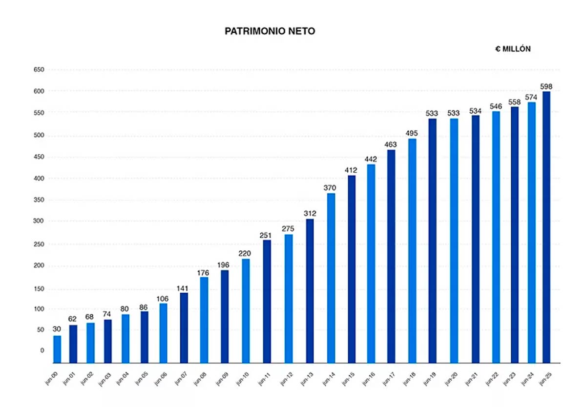 Como hemos dicho el beneficio después de impuestos es de 24 millones de euros. Tanto el beneficio como el patrimonio neto continúan una buena línea iniciada hace mucho tiempo. Salvo los años del covid, donde hubo superávit, aunque pequeño, el patrimonio neto no ha hecho sino subir a lo largo de los años.