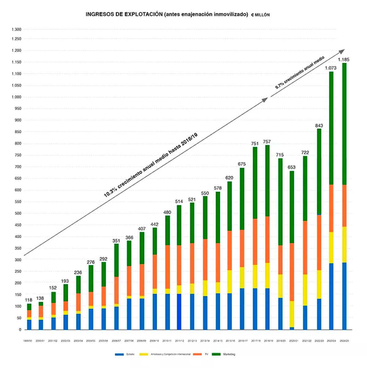 Todas las líneas de negocio han experimentado crecimiento, excepto la retransmisión, porque no se han imputado ingresos de market pool UEFA debido al nuevo sistema de reparto en la temporada 2024/25, algo inferiores a los de la anterior. El dinero recibido de la Liga también ha sido menor que el de la campaña pasada.