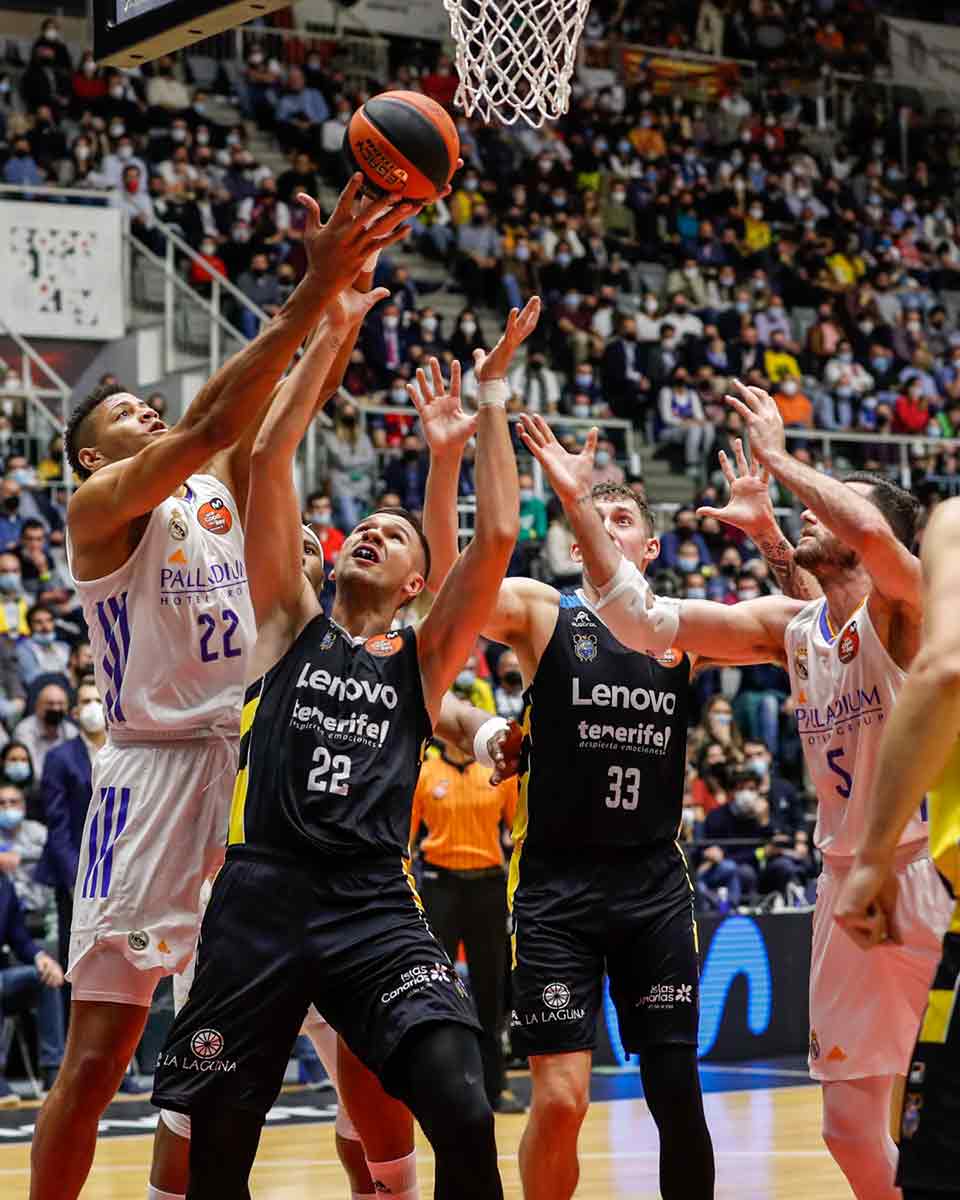 El primer cuarto sentó las bases de esta dinámica mejorada, con mayor presión defensiva y ritmo en las posesiones. Con el lunar de las pérdidas, ofreció un gran acierto en la línea de tres. La actuación de los grandes —Tavares, inmenso, una vez más, y Thompkins con una entrada brillante en el encuentro— resquebrajó la defensa rival. Las rotaciones mantenían el ritmo y el tino. El partido hubiera quedado casi sentenciado en el descanso de no ser el Lenovo Tenerife un equipo tan calmado como ordenado. Aun y cuando Marcelinho no tenía su mejor día —acusó la constante presión de los diferentes defensores que le enviaba Laso—, su carácter e inteligencia bastaron para que el esquema no se desdibujara y conservar sus opciones en juego.