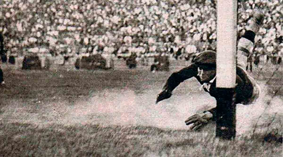 El formidable delantero Escolà recibe en el área un pase de Ventolrà. Está solo ante Zamora y puede elegir el lado por donde clavar el gol. El madridismo se encoge, los culés levantan los brazos en espera del gol. El chut, fuerte y ajustado, va al palo izquierdo de Zamora. Es un disparo imparable. Imparable para todos menos para el portero blanco, que, con una inverosímil estirada, no despeja, sino que atrapa el balón y alcanza la inmortalidad.