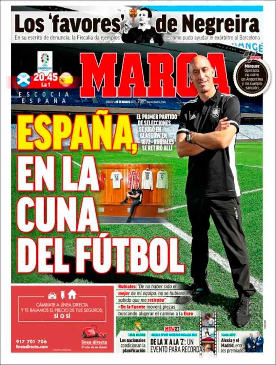La portada de Marca con Rubiales es patética. El presidente de la RFEF, que debería estar apartado de sus funciones pod el CSD, presumiendo de que era mu güeno jugando al furgol. No se si era bueno o no. Toda mi vida he seguido el futbol español y, sinceramente, no le recuerdo. Eso sí como cuñao, en nochebuena debe ser de lo peorcito que te puedas encontrar. Lo siento por su familia política.