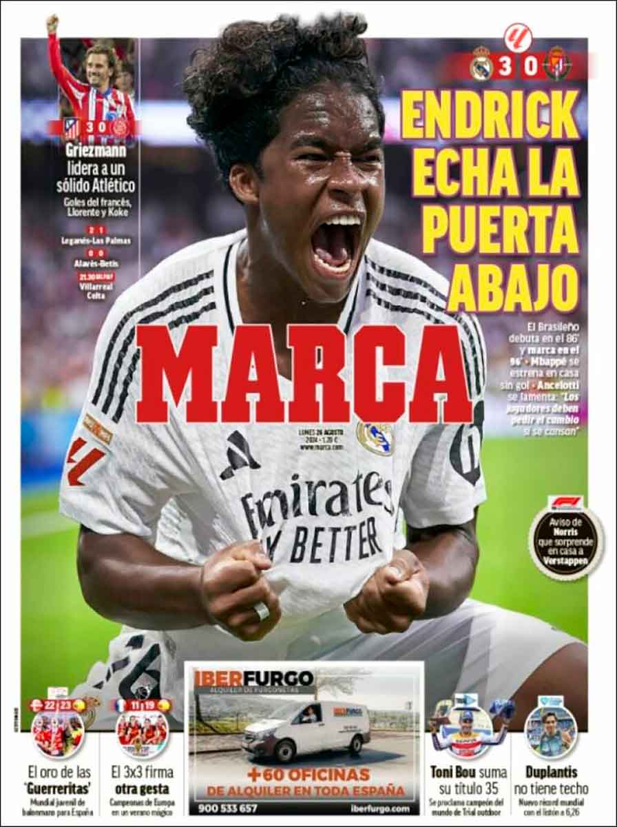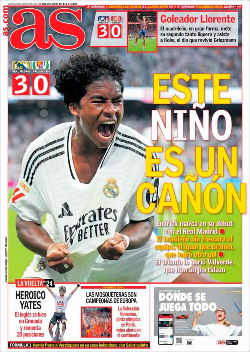 Buenos días, amigos. El Madrid se impuso por 3-0 al Valladolid, en un partido infumable en el primer tiempo y más animado en el segundo que estaba destinado a tener por protagonista a Mbappé, y que al final pasará a la historia por haber registrado el debut goleador de Endrick. Fue un récord: ningún jugador extranjero ha marcado en el Bernabéu siendo tan joven. El chaval es una bestia parda, como diría un clásico, con una facilidad pasmosa para armar el gatillo y un chut de una potencia sobrenatural. Marcó con un latigazo imparable con su pierna supuestamente mala, la derecha, después de prepararse un balón de Brahim, que fue el otro destacado del partido saliendo desde el banquillo y anotando también su golito.