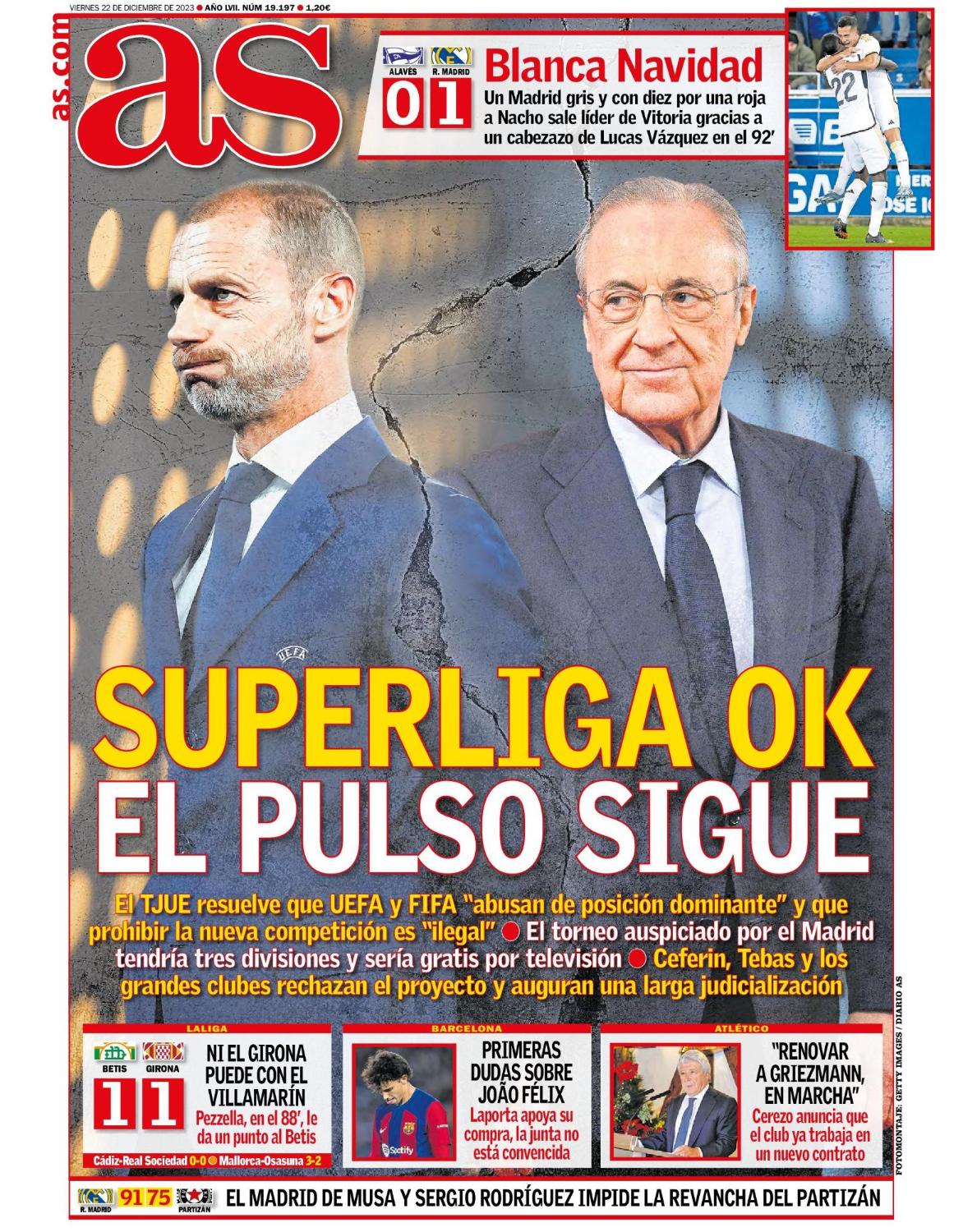La portada de As lo resume muy bien, bajo un montaje fotográfico en el que Ceferin resopla con el agua al cuello y Florentino le dedica una mirada maliciosa. “El pulso sigue”, sí, pero con la inmensa diferencia de que ahora todo depende de la voluntad de cada entidad deportiva, no de un ente organizador opaco que explota un balompié que no le pertenece.