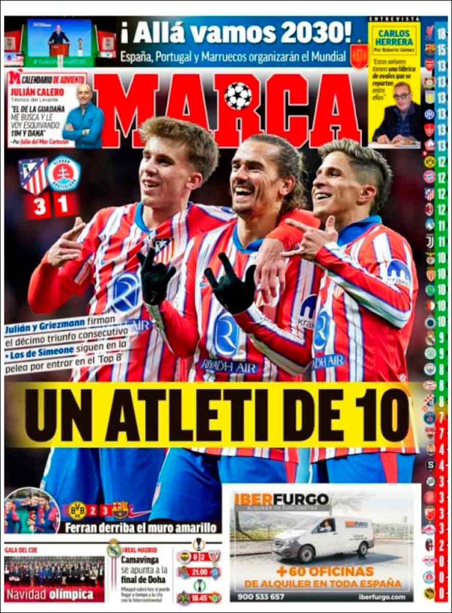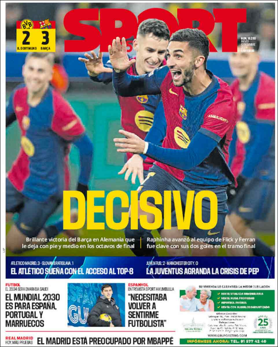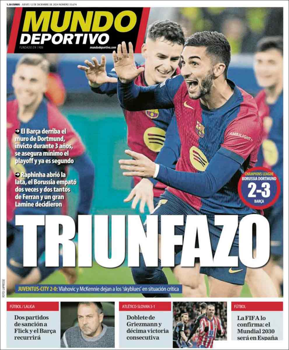 La prensa cataculé también roza la euforia ante la controvertida victoria de ayer en Dortmund del equipo cliente de Negreira. Decimos controvertida porque se privó a los alemanes de un penalti y se concedió un gol culé precedido por clara mano de Olmo. ¿Hay un Negreira europeo? La sospecha acompañará a estos sujetos hasta el fin de los tiempos. Esa sospecha es la única forma de justicia que nos queda.
