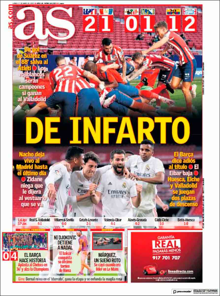 Por supuesto, nada de esto aparece en las portadas del día. Ni Marca (el diario de todas las aficiones) ni mucho menos As (el diario de la afición cuya presumible agenda de celebración del título viene marcada por una sarta de neonazis que se pasan las precauciones del Covid por sus fascistas entrepiernas) tienen a bien referirse a esto. La de Mateu ayer fue solo la penúltima barrabasada. Tenemos la certeza de que fue solo la penúltima por la sencilla razón de que fue la penúltima jornada de Liga. Habrá una última, a buen seguro. Y no habrá otras más allá porque no queda Liga después.