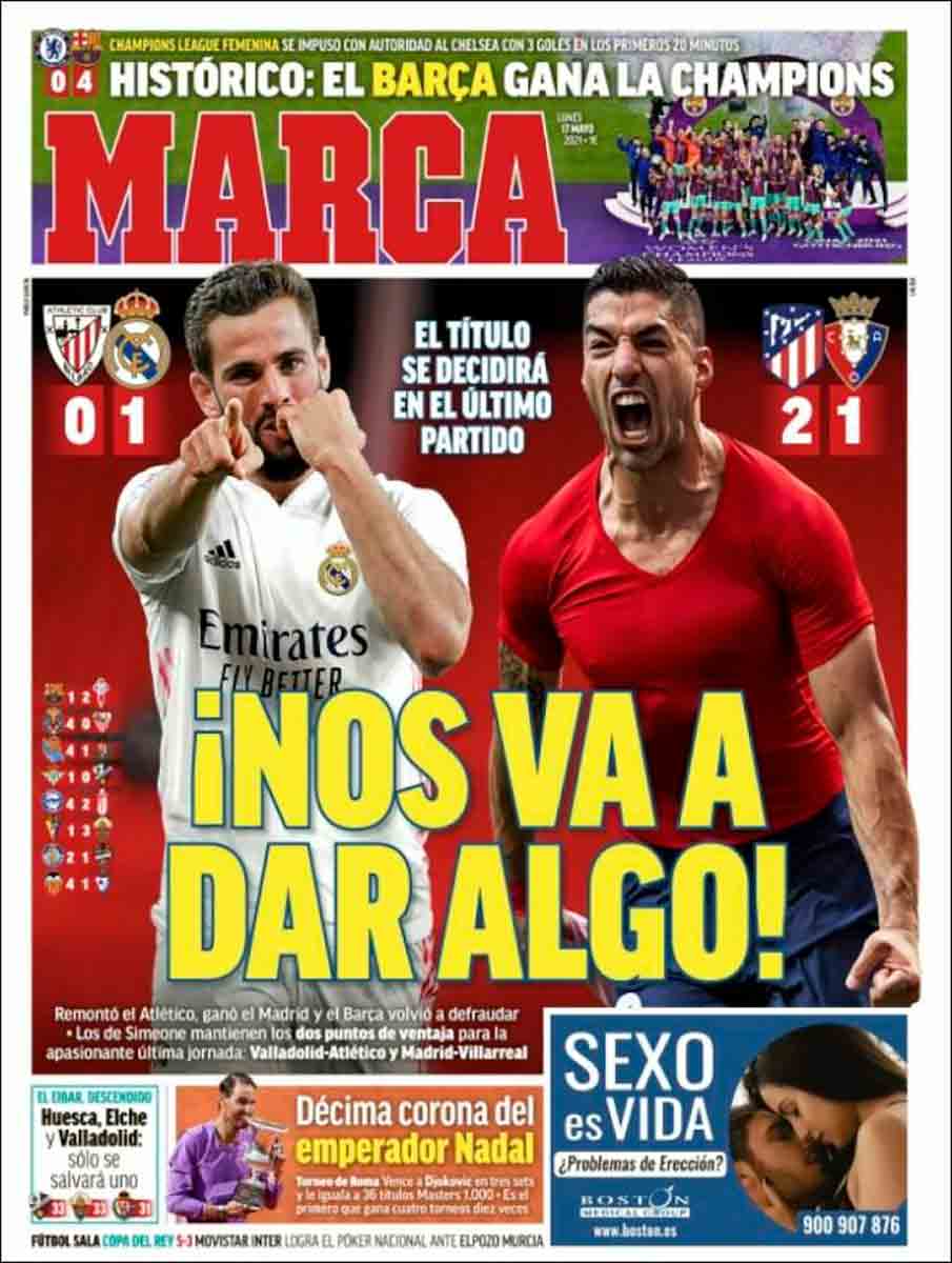 La portada de los adláteres de Gallardo está incompleta: "Nos va a dar algo... si al final no gana nuestro equipo (el Malakito)". Y con respecto al Madrid, decir que con covid (se contagiaron jugadores, técnico, presidente...), lesiones, atracos, robos, campañitas permanentes y resto de obras del muladar, se ha llegado a semifinales de Champions (único equipo español y se llega a la última jornada con opciones (en una liga no adulterada ni pasada por las manos de la mafia, hace 5 jornadas que sería campeón), lo que nos indica el gen ganador del Madrid, sobreponiéndose a todos los obstáculos y a todos los agentes de The Tinglao. Admirable aunque no se gane nada.