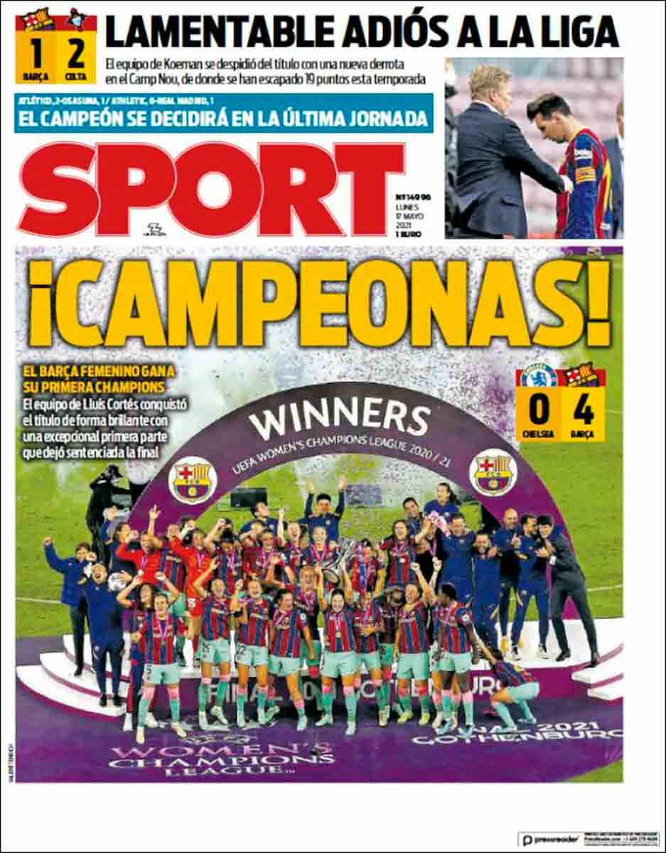 Los dos periódicos cataculés se abrazan sin remilgos a la suerte de haber coincidido el adiós liguero de sus chicos con la Champions de sus chicas. Nosotros pensamos que el mejor favor que le podemos hacer a la causa del fútbol femenino es rehuir toda tentación de condescendencia, y proclamar que no nos hace ninguna gracia que el Barça de mujeres gane la máxima competición continental. Enhorabuena y preparaos, que las mujeres blancas (leed la crónica de ayer de Fernando Alcalá-Zamora) están preparándose para convertirse en serias rivales en la búsqueda de la gloria.