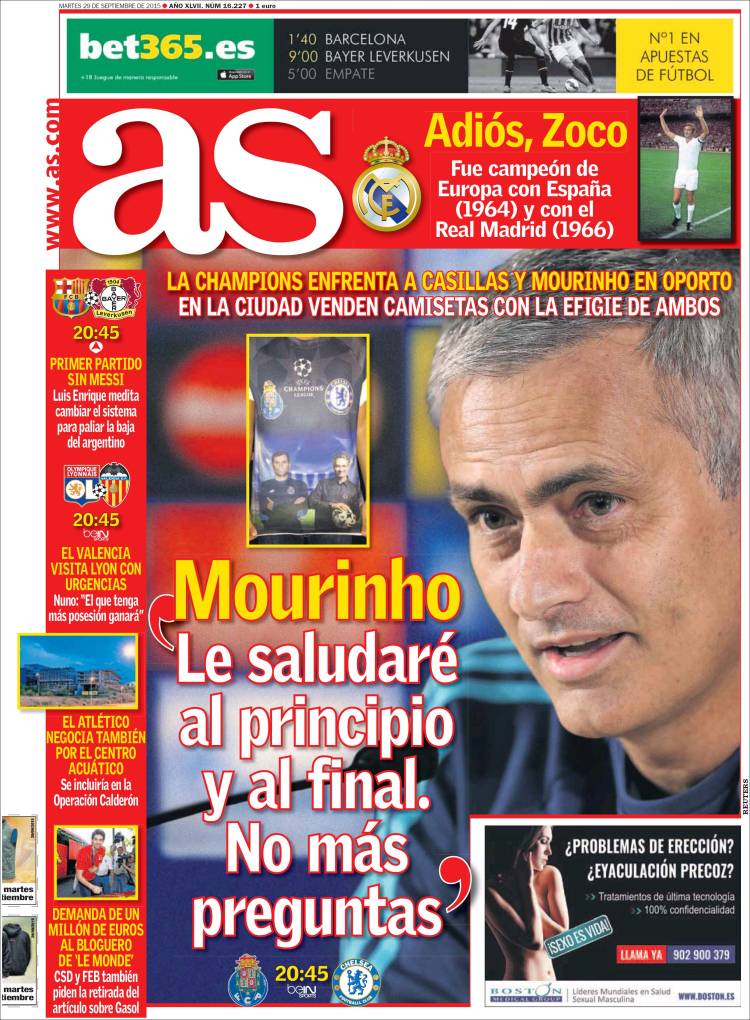 En el caso de Mourinho y Casillas, la maldición no se concreta en duelos al amanecer más que muy raramente. De hecho, no habíamos tenido un enfrentamiento cara a cara entre ambos hasta esta noche, cuando la Champions les ponga frente a frente en la ciudad de Oporto. Sin embargo, un duelo soterrado, implícito, lleva dirimiéndose en las portadas de los principales periódicos deportivos desde el mismísimo día en que Mou abandonó el Real Madrid. Esta noche, a las 20:45, el rencor irrestañable va a hacerse carne y habitar entre nosotros.