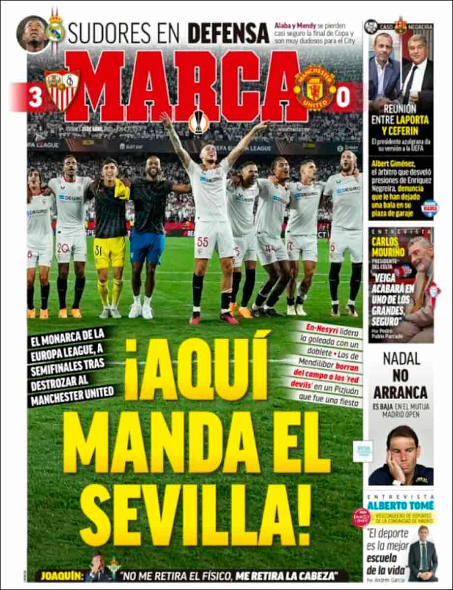 Felicitamos al Sevilla por este logro al que brinda Marca el espacio principal de su portada. Ya sabéis que este diario suele dedicar el espacio de sus primeras planas para atacar al Madrid, para ceder el estrado a los enemigos del Madrid, para defender una noble causa que les haga acreedores de una bondad absoluta, o bien, lo más habitual, para abarcar mucho y apretar poco. De vez en cuando se les cuela una buena o incluso excelente portada.