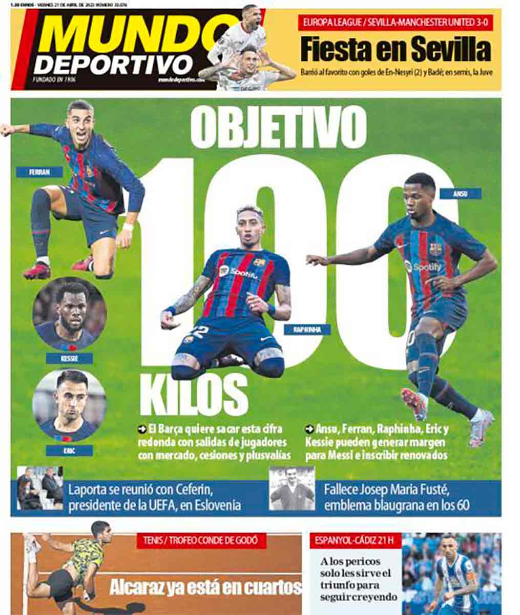 El titular de Mundo Deportivo: “Objetivo 100 kilos” es muy apropiado en días en los que la palabra más repetida es régimen. Es aconsejable marcarse metas prudentes que poco a poco acerquen al objetivo. En el caso de la salud, si uno necesita bajar mucho peso conviene hacerlo paulatinamente y sin recurrir a ningún régimen milagroso. Un buen primer objetivo son los 100 kilos y a partir de ahí ir poco a poco acercándose a una meta saludable.