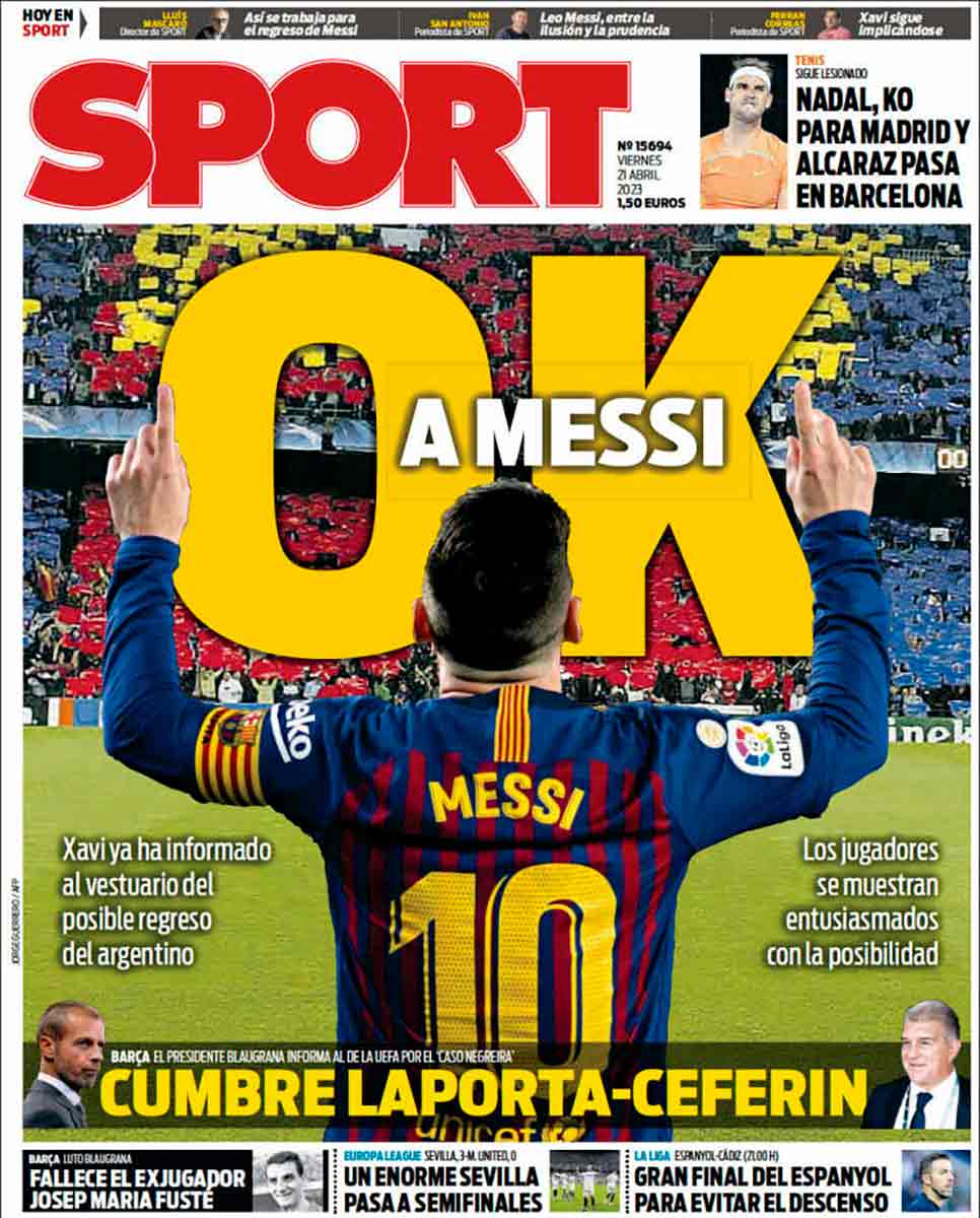 Sport sigue atascado en el tema Messi, Sport es la sirena varada. Suponemos que permanecerá anclado ahí hasta final de temporada. Está todo el mundo entusiasmado ante la posibilidad de que vuelva un futbolista más cercano a disfrutar viajes del IMSERSO que a resultar determinante en un partido de fútbol sin trazas de amaño arbitral. Son sus costumbres.