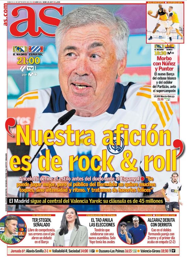 Las portadas dejan un hueco menor para el primer Real Madrid-Barça de la temporada de baloncesto, una semifinal de la Supercopa en la que los azulgranas no deberían haber estado, dada su clasificación en la Liga y la Copa pasadas, pero, oh, amigos, casualmente se designó Murcia como sede de la competición y el finalista de la pasada ACB pasó milagrosamente a ser también el anfitrión y permitió liberar una plaza para que los culés pudieran entrar. En cualquier caso, será un partido muy entretenido en el que nos costará ver a un Real Madrid renovado, pero sin Rudy ni el Chacho, frente a un Barcelona que ha vuelto a tirar la casa por la ventana para reforzar el equipo. El Real Madrid ha ganado las últimas seis Supercopas de España y la que hoy comienza será una magnífica piedra de toque para comprobar el encaje de los nuevos fichajes, Feliz, Rathan-Mayes, y el retorno de Ibaka y Garuba. Stairway to heaven una temporada más.