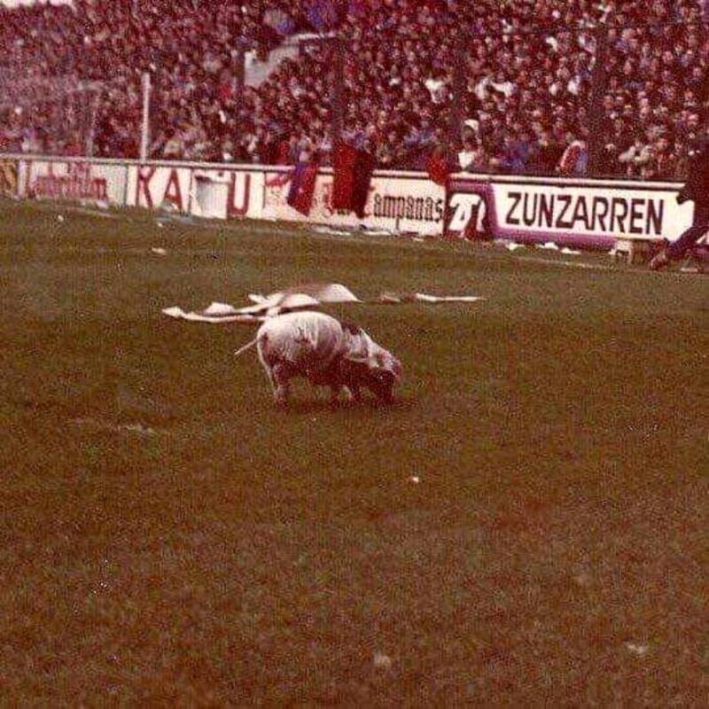Un año más tarde se produjo un hecho lamentable cuando un aficionado soltó un cerdo en el terreno de juego al que le habían puesto la camiseta con el dorsal 7 de Juanito. Aquel partido terminó 2-1, con Santillana expulsado por insultar al árbitro, un largo descuento en la segunda parte y la hinchada rojilla provocando distintos incidentes.