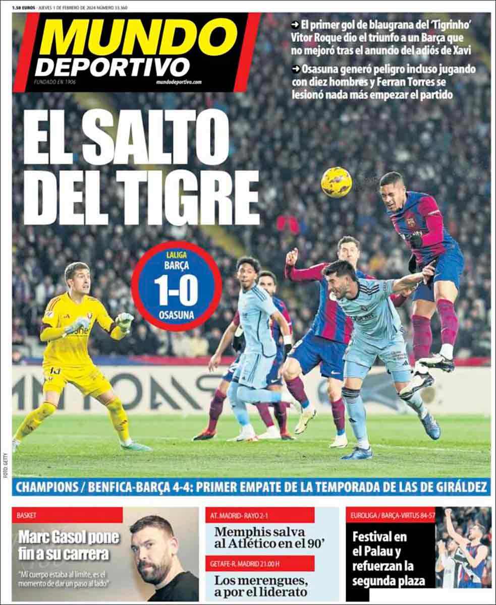 El diario de Godó, en un ejercicio de brillantez a la altura de cómicos de los años setenta y aprovechando que al nuevo brasileño del Barça le apodan Tigrinho, titula que Vitor Roque perpetró el salto del tigre. En la foto han tenido la delicadeza de no mostrar ni el armario trampolín ni sobre quién ejecutó el salto del tigre.