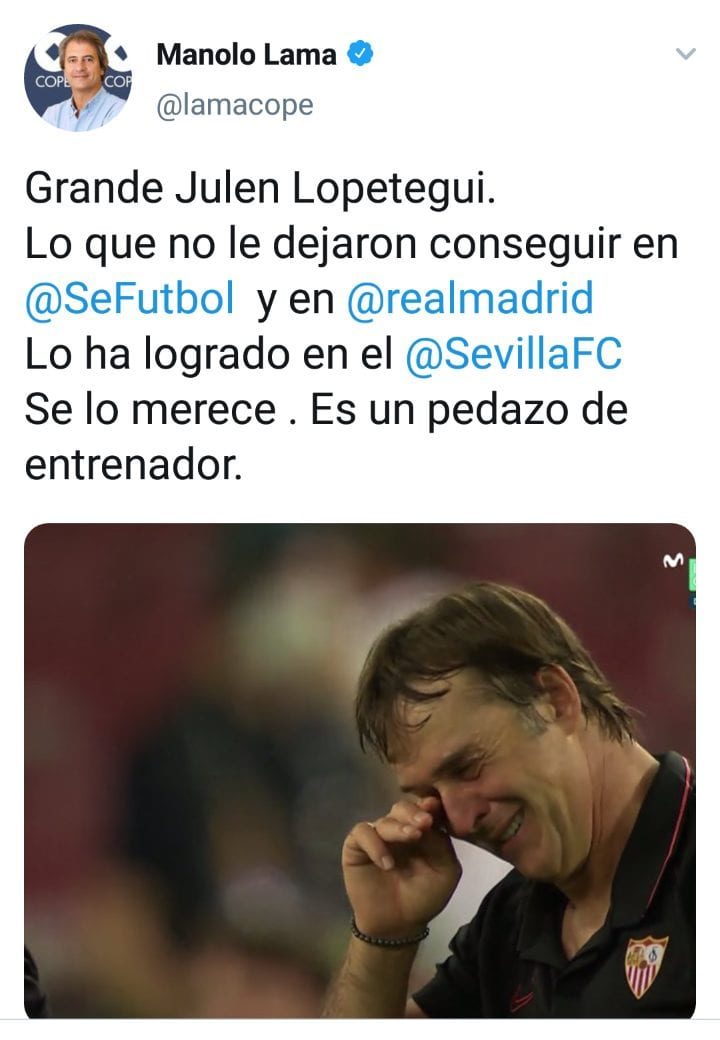 Lo de la prensa vergonzoso como siempre. Enhorabuena al Sevilla que ha ganado un trofeo que para su nivel es lo máximo a lo que puede aspirar. En cuanto a lo de Lopetegui, creo que fracasó en el Madrid porque vino en el peor momento posible, porque le quitaron a Cristiano y le trajeron a Mariano, y sobre todo porque no supo imponerse a los jugadores y a un presidente que siempre le vio como alguien transitorio. Creo que es un buen entrenador pero como a Pellegrini o a Benitez, les faltó decir en voz alta que necesitaban refuerzos. Cuando se traga con todo en Agosto no puedes llegar a Diciembre y quejarte de la planificación.