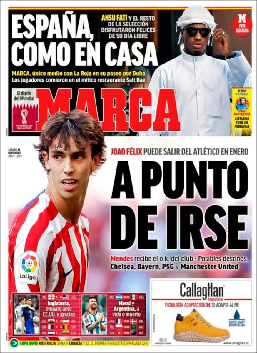 Para Marca, la principal noticia es que, según ellos, Joao Félix puede salir del Atleti en enero. Salga o no, ni el futbolista ha demostrado lo que se esperaba de él por la calidad que atesora ni el club ha estado a la altura de las pretensiones deportivas del jugador.