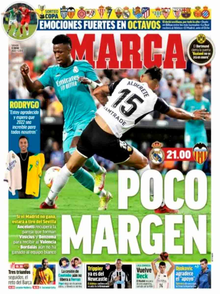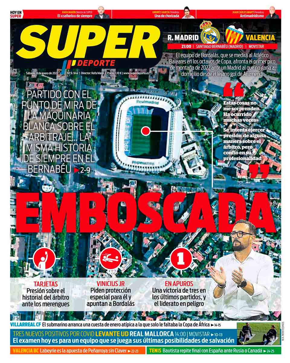 “Piden protección especial para Vinícius y apuntan a Bordalás”, profieren, para que el bueno de Vini salga hoy al verde escoltado por una patrulla del CNP y una pareja de la Guardia Civil, en tanto que en el banco visitante —Superdeporte dixit— se sienta el Kingpin del Levante.