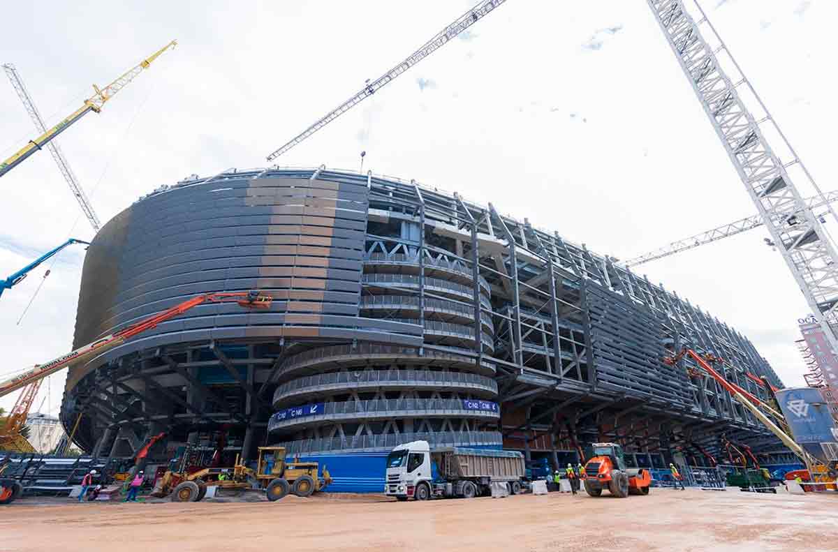 Todas estas ideas lo embotan a uno cuando ve de cerca la obra de La Castellana. De primeras, el Nuevo Bernabéu te obliga a mirar para arriba, a levantar la cabeza. Eso ya es bastante, no es en absoluto una cosa menor. Si el Madrid, como brisa moral, lo levanta a uno del sucio presente, su nuevo estadio lo invita, como si fuera un reflejo material del impulso espiritual madridista, a alzar la cabeza, a caminar erguido y asombrado ante el espectáculo de elementos aéreos que operan por el cielo de Madrid y sur trabajan en la construcción de un nuevo templo a la mayor gloria de Dios. Es igual que cuando se entra en el Gesù de Roma o en la basílica De los Santos mártires que diseñó Miguel Ángel en las termas de Diocleciano, es lo mismo que cuando se admira la linterna barroca de la catedral de Toledo. La elevación del alma, en un mundo tan absurdamente materialista, conecta el empeño edilicio de Florentino con la tradición que empieza en las pirámides de los faraones egipcios, que sigue en la Acrópolis de Atenas y en las catedrales góticas europeas y que termina en los rascacielos de acero y de cristal de Manhattan. La tradición de lo sublime, del engrandecimiento de los sueños y de las ambiciones del hombre corriente, la tradición de la trascendencia.
