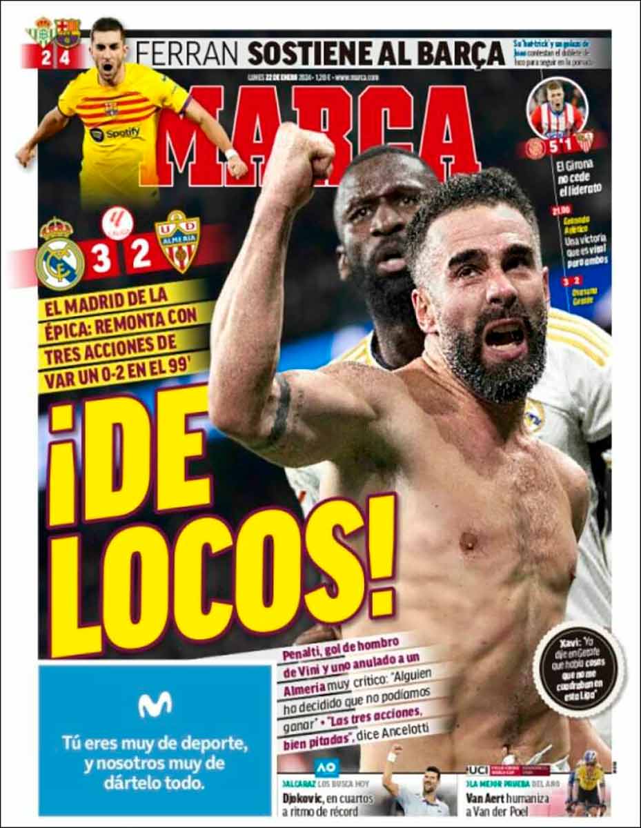 As pone el acento en el VAR, lo cual no es faltar a la verdad porque el VAR fue fundamental en sus aciertos, e ilustra el tema con parecida foto a la de Marca: Carvajal en el éxtasis del gol que sellaba la remontada. "Carvajal, te quiero", cantó el público, e hizo muy bien. Representó, como siempre, la casta indomable del Madrid, marcó el decisivo en el descuento y fue el mejor junto a Bellingham, que volvió a desempeñarse con primor y denuedo, a punto incluso de marcar en una chilena espectacular. Leed la crónica de Ramón Álvarez de Mon para más detalles.