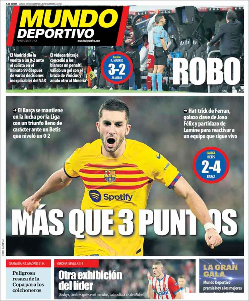 "Robo", titula también Mundo Deportivo, a quien cabe hacer la misma pregunta que a Melero. ¿Tenéis por ahí las facturas que acreditan vuestras palabras gruesas, chatos? Nosotros sí tenemos las vuestras, y no se refieren a un partido en concreto, sino a lustros y lustros de (ahora sí) robo de la competición. Hay quien no se ha dado cuenta aún de que ya no estamos en la era de la moviola. Estamos en la era de las facturas.