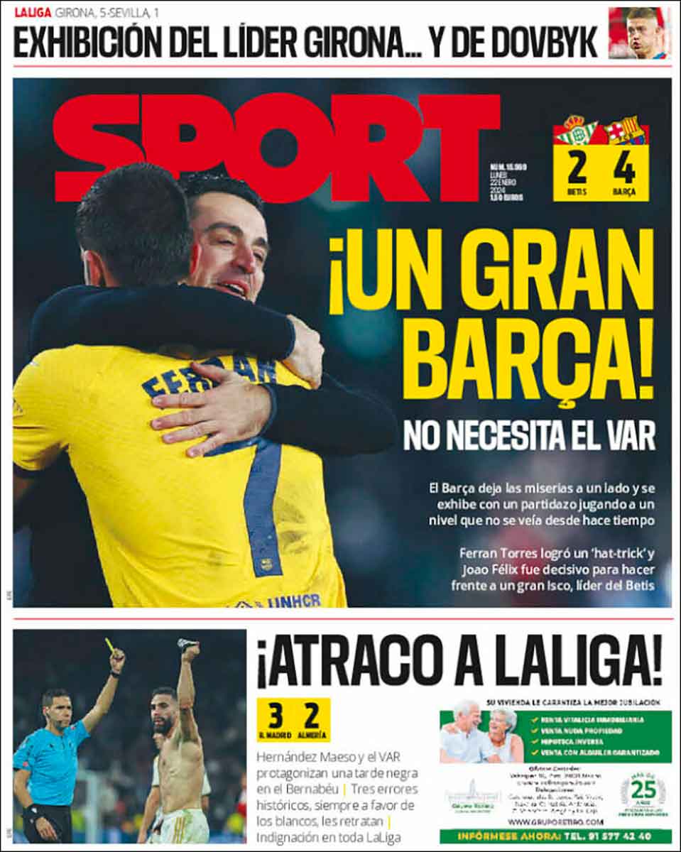 Por lo demás, Sport abre con la foto del propio Xavi abrazando a Ferran, celebrando la remontada culé ante el Betis. Xavi dijo que ve muy difícil esta liga para el Barça, dando a entender un favoritismo del estamento arbitral con el Madrid. El entorno culé, cuando no puede comprar los arbitrajes, se queja de ellos, sin que ambas cosas sean incompatibles.