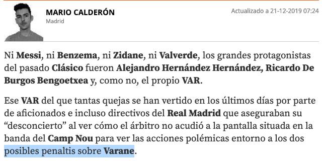 A final de la semana Varane agredió a rakitis y le clavó su pierna al pobre lenglet en sus tacos, sucio Raphael muy sucio, Hernández Hernández y de Burgos Bengoetxea magníficos árbitros imparciales....ya lo verán el Var ayuda a ganar 2 ligas de las ultimas 11, y en Europa ganamos tantas orejonas por que no jugamos contra nadie, ya saben bolas calientes y demás ...y ZZ pues con su flor, ahí tienen al periodismo actual y se quejan de que su trabajo no sea reconocido y cada vez se vendan menos panfletos...perdón periódicos, así esta la cosa una mentira 1000 veces repetida la convierten en verdad o al menos eso pretenden la mafia proVarza con sus lacayos los segurolas maldinis castaños carreños lamas y demás calaña