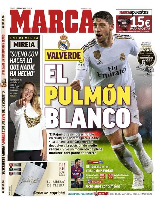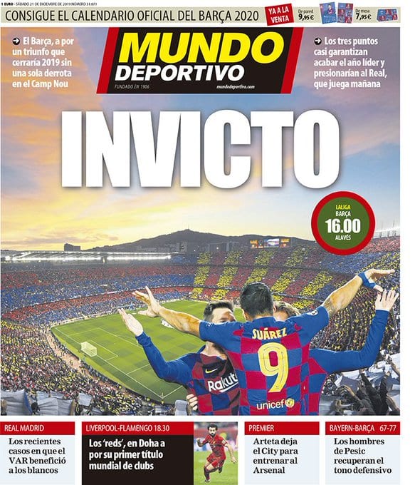 En el resto de medios de comunicación, alabanzas a Fede Valverde y al Real Madrid en la capital, y despedida al 2019 en la Ciudad Condal, ya que hoy juega el Alavés en el Camp Nou. Presumen los diarios cataculés de la imbatibilidad del Barcelona en casa. Desde luego que con arbitrajes como el del miércoles es mucho más fácil no perder jugando como local.