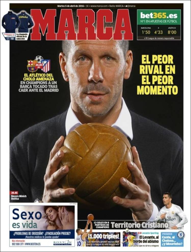 Simeone ocupa la práctica totalidad de la portada de The Hernia Chronicle y nos parece razonable porque hoy juega el Atlético de Madrid un partido europeo de muchísimos quilates. Lo que nos llama la atención es la completa ausencia del affair Messi en una primera plana donde hay incluso un discreto lugar para el número de triples alcanzados por los Warriors en la lejana NBA.