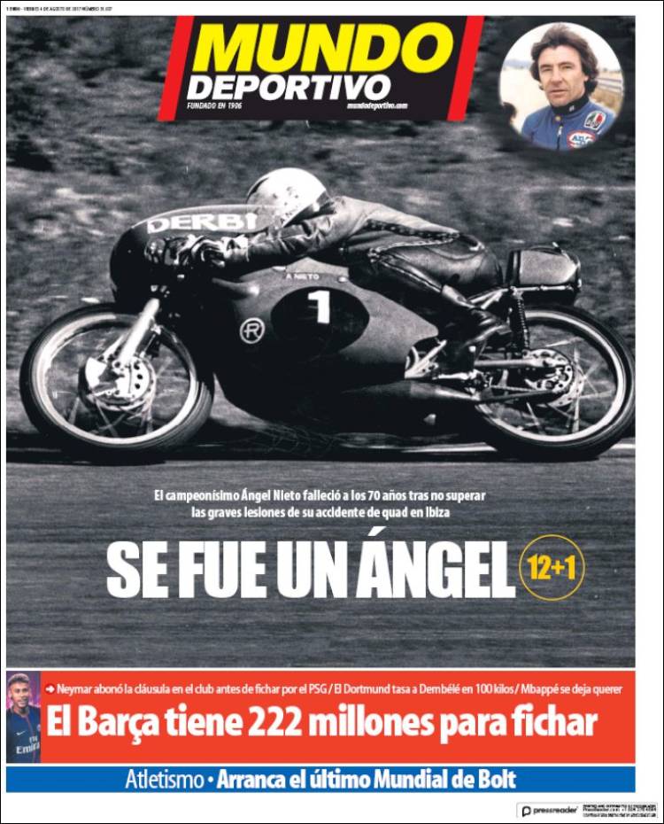 Ángel Nieto era madridista, español y muy orgulloso de ambas cosas. Y sin ser al menos catalán,se entiende que han hecho un esfuerzo meritorio al darle casi todo el protagonismo de la portada al genial piloto.
