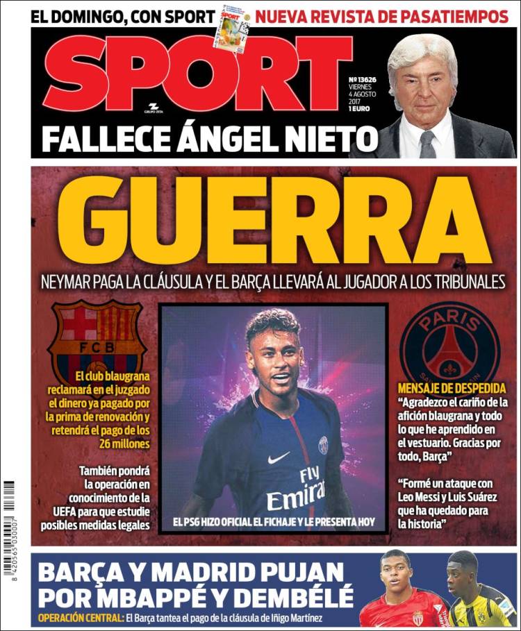 En cuanto al Sport se refiere, anuncian que se ha iniciado una guerra en alguna parte, que Barsa y Madrid pujan Mbappé y Dembelé y que el Domingo hay nueva revista de pasatiempos.