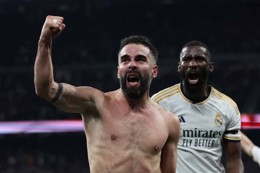 Sería el brasileño quien igualara el marcador con un gesto propio del fútbol ginga que todo brasileño virtuoso lleva en sus venas. El gol de Vinicius es propio de un genio. Ese remate con el hombro es un recurso que ya le hemos visto, al menos recuerdo una vez anterior. El cielo es el único techo del brasileño que crece y crece en su fútbol. Respecto al mismo, el propio Vinicius se refería a él en su cuenta de Twitter: «¡Golazo! Así lo hacía siempre en la playa de Copacabana». Y ya sería en la prolongación cuando en una contra fenomenalmente iniciada por Eduardo Camavinga, Dani Carvajal conseguía el gol de la victoria y se desataba el éxtasis en Chamartín. Cuatro goles lleva ya el canterano. De récord para un lateral derecho.