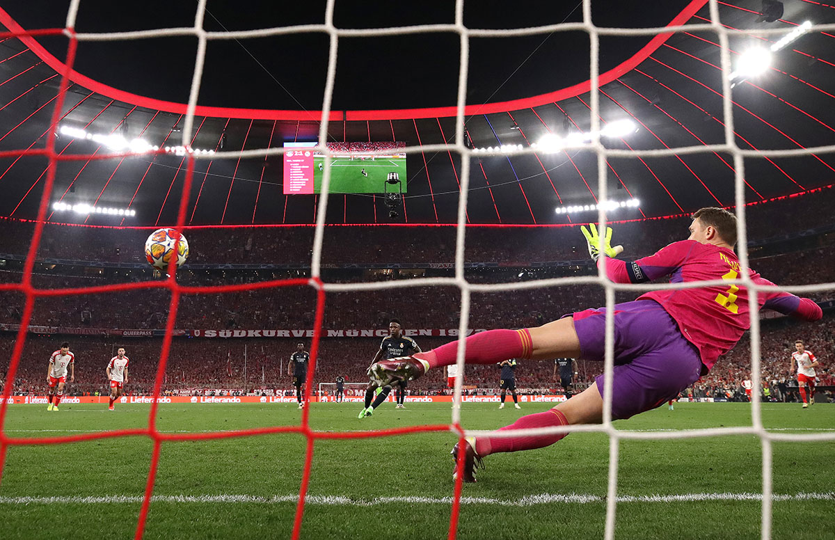 La semifinal en Munich contra el Bayern de Neuer y de Kane fue otro ejercicio de supervivencia. La varita mágica de Kroos apareció para ponernos en ventaja ofreciendo un gol gratis a Vini. Más tarde, Toni pudo matar el partido con un chut a la escuadra que Neuer sacó incomprensiblemente. El Bayern lanzó a sus jóvenes delanteros en contras letales durante el segundo tiempo y consiguió remontar con un cañonazo de Sané dentro del área y con un penalti sobre Musiala que transformó Kane. La cosa pudo ponerse peor, hablamos del Bayern, amigos. Nobleza europea. Pero Vini empató el partido lanzando un penalti académico sobre la meta de Neuer tras un agarrón a Rodrygo en el área pequeña. Espadas en todo lo alto para la vuelta.