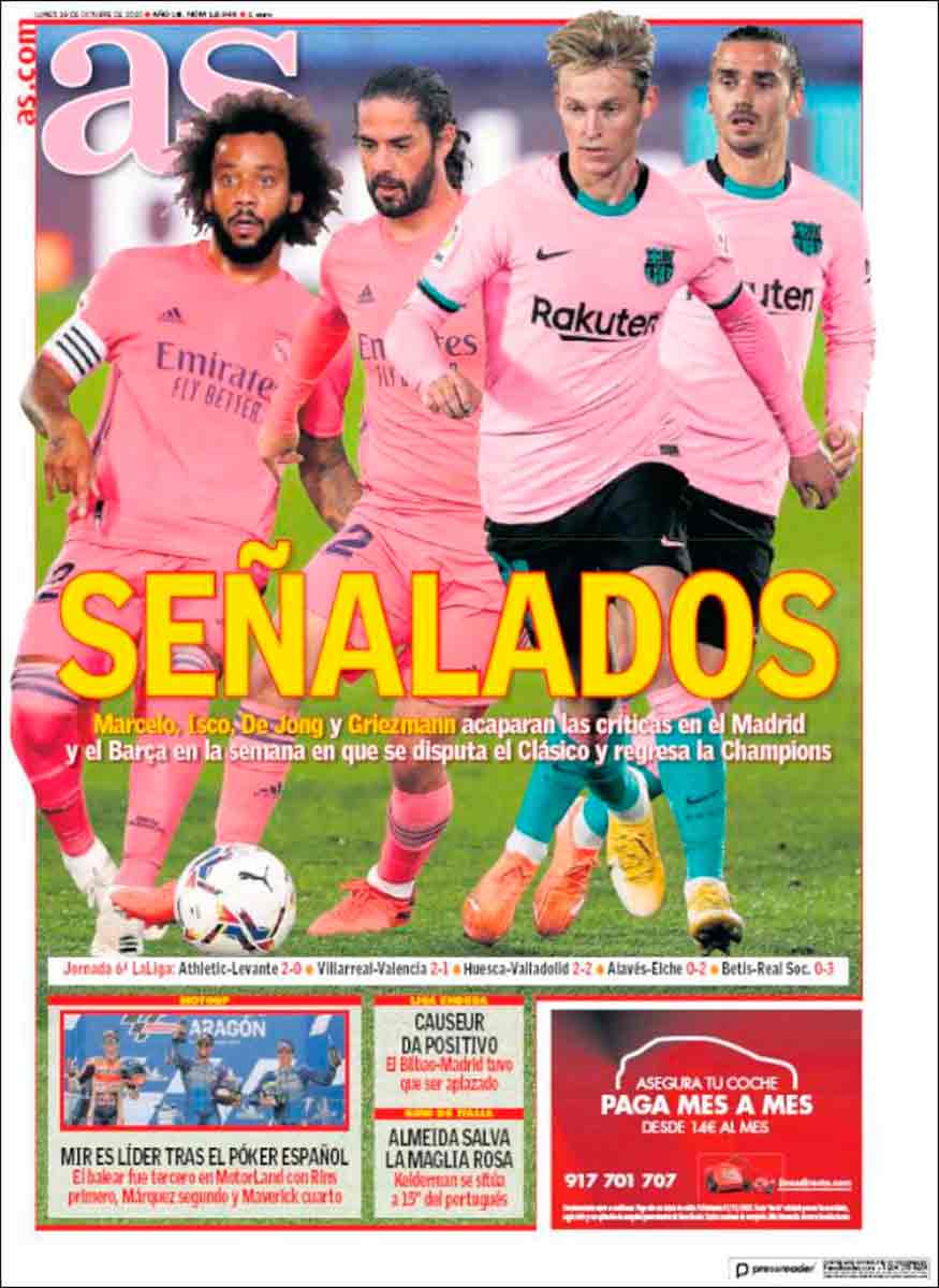As es el único de los cuatro jinetes del Apocalipsis que se acuerda de ambas derrotas, aunque también es el único que personaliza las culpas de las mismas en cuatro jugadores, dos del Barça, dos del Madrid. Extiende primero para luego aplicar el foco. Marcelo, Isco. De Jong, Griezmann. “Señalados”.