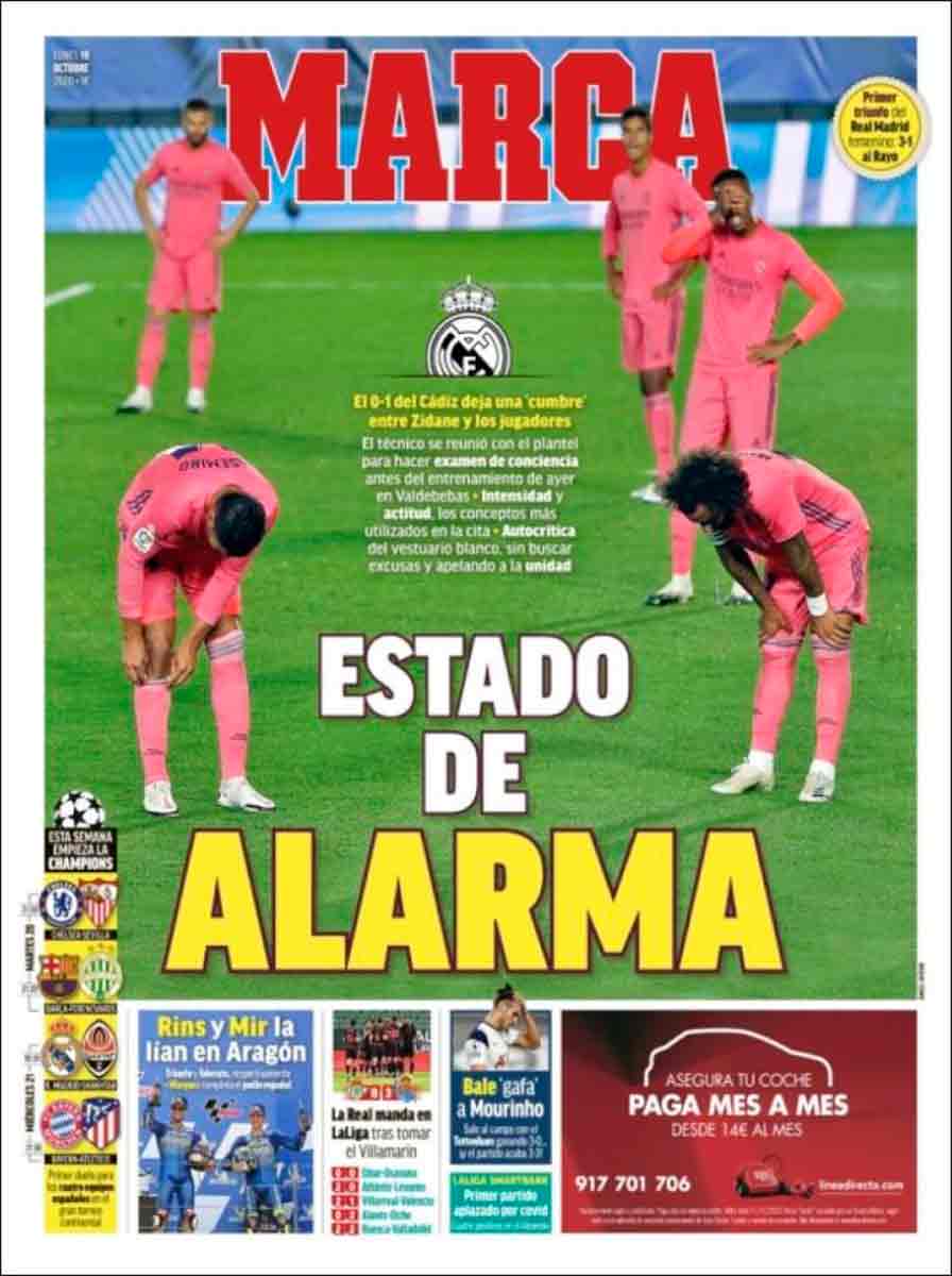 Buenos días. Nada que objetar, sino todo lo contrario, a la frase de uso político-sanitario que Marca toma prestada para representar la situación en el seno del madridismo después de la bochornosa derrota sabatina ante el Cádiz. Estado de alarma. Pues sí.