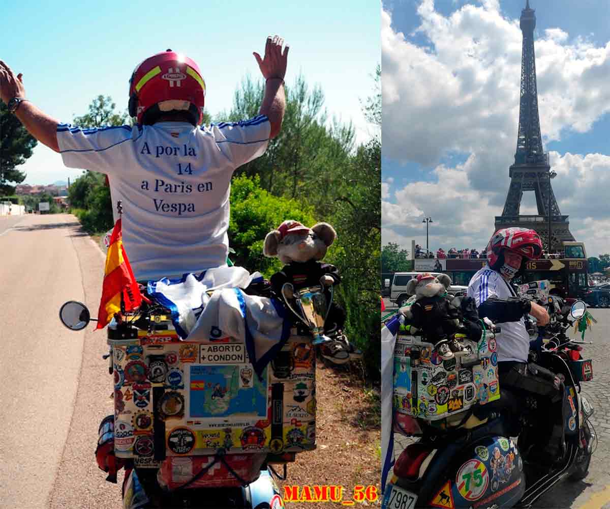 Esta es la historia de Manuel Martín, conocido en el mundillo del scooter clásico como “Mamu”. Un vespista consagrado que lleva sus pasiones al extremo. Cuando la salud le ofreció un respiro, subió a Cabo Norte en Vespa: el anhelo de todo motoviajero. Es habitual verlo en eventos y concentraciones, siempre con su scooter listo para el viaje y con su conocido carácter “tan especial”. Porque hay que tener carácter para ir a Paris en Vespa a recoger una Copa de Europa. Recorrió más de 1.400 Km a la ida en 3 etapas y otros tantos a la vuelta. Entró en Paris a trompicones. Sí, experto y contrastado conductor, pero la ocasión suponía un esfuerzo superior. Viajero incansable en solitario; este último viaje fue mucho más que un reto. Llevaba en la cabeza y el corazón sus dos pasiones: la Vespa y al Real Madrid.