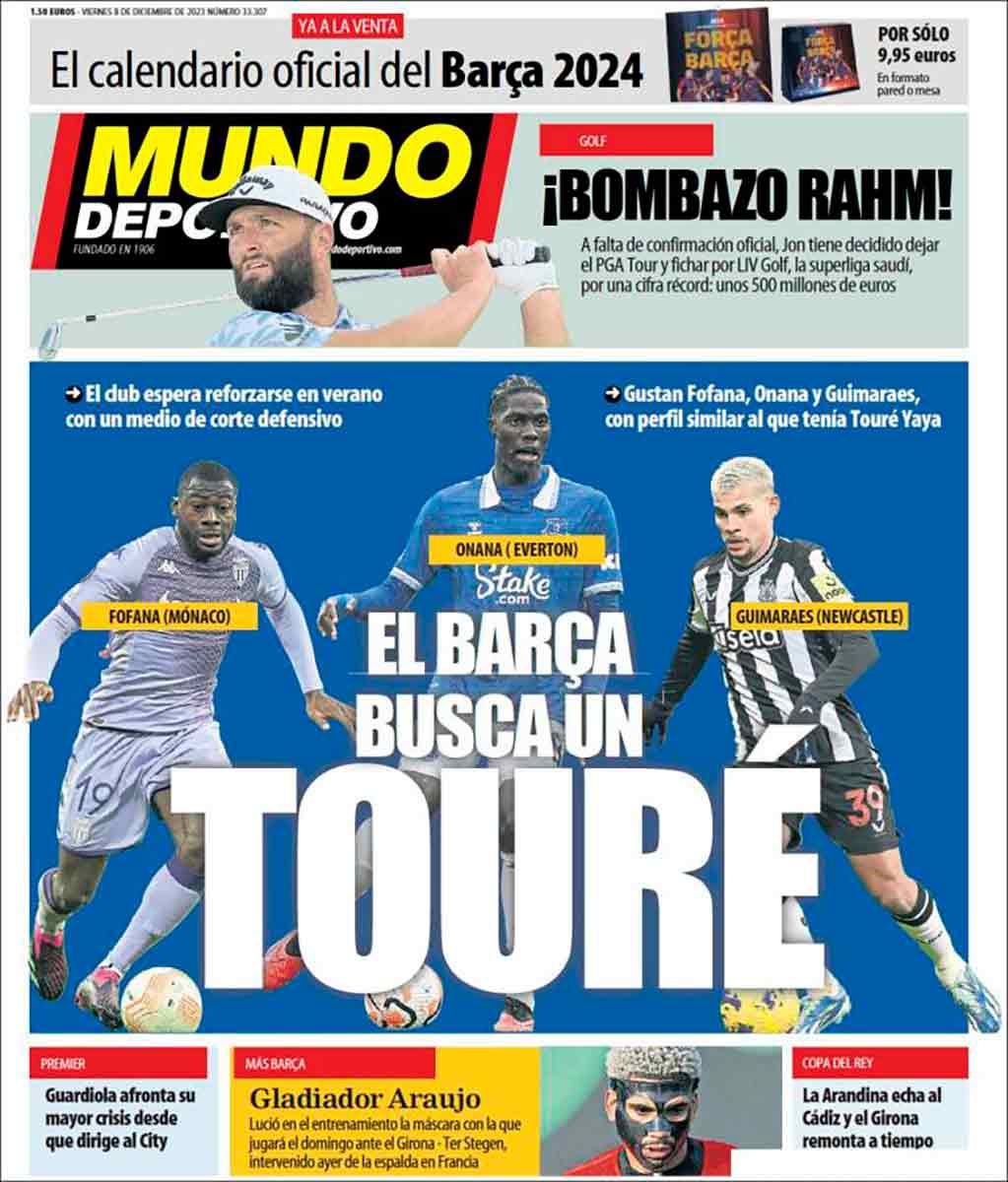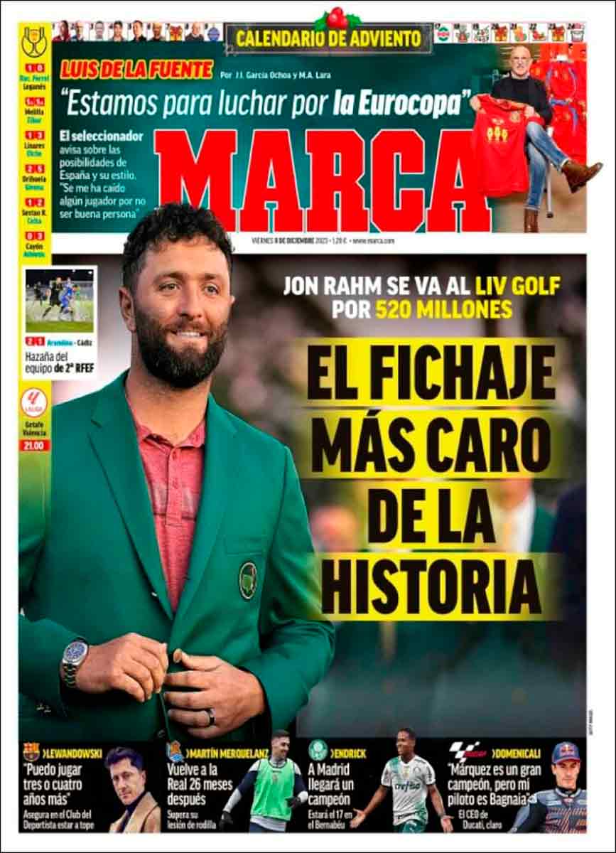 Marca no trae el fútbol como argumento principal del día, sino el golf. Y no es que le hayan preparado un mandoble retrospectivo a Bale, ni que le hayan reinventado una hernia, sino que Jon Rahm ha firmado por 520 millones por el Liv Golf, o sea, que los saudíes se lo han comprado para su campeonato. Las cosas de este mundo, amigos, se dividen entre las que ya ha comprado algún país del Golfo y las que se preparan para ser compradas por algún país del Golfo. Ni siquiera tú, querido lector, que te las prometes muy tranquilo en tu piso de Coslada, quedas fuera de esta regla. Queda por saber si un jeque va a comprar el equipo de tu barrio para hacerte jugar ahí, o si te va a importar directamente a sus áridos parajes. Ganarás más dinero, y a lo mejor (pero sólo a lo mejor) eso es lo que importa.