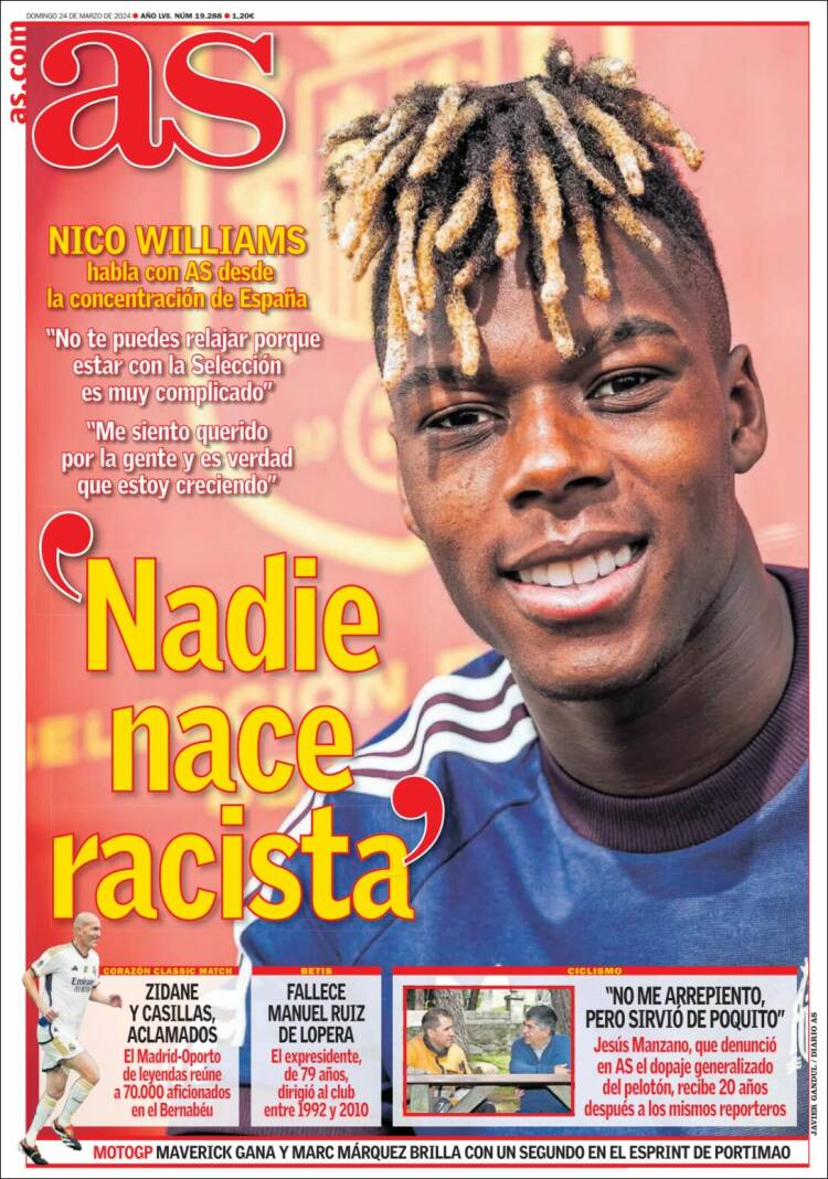 El diario As, por su parte, regala la portada casi entera a Nico Williams, uno de los pocos jugadores reconocibles de la selección de Luis de la Fuente.