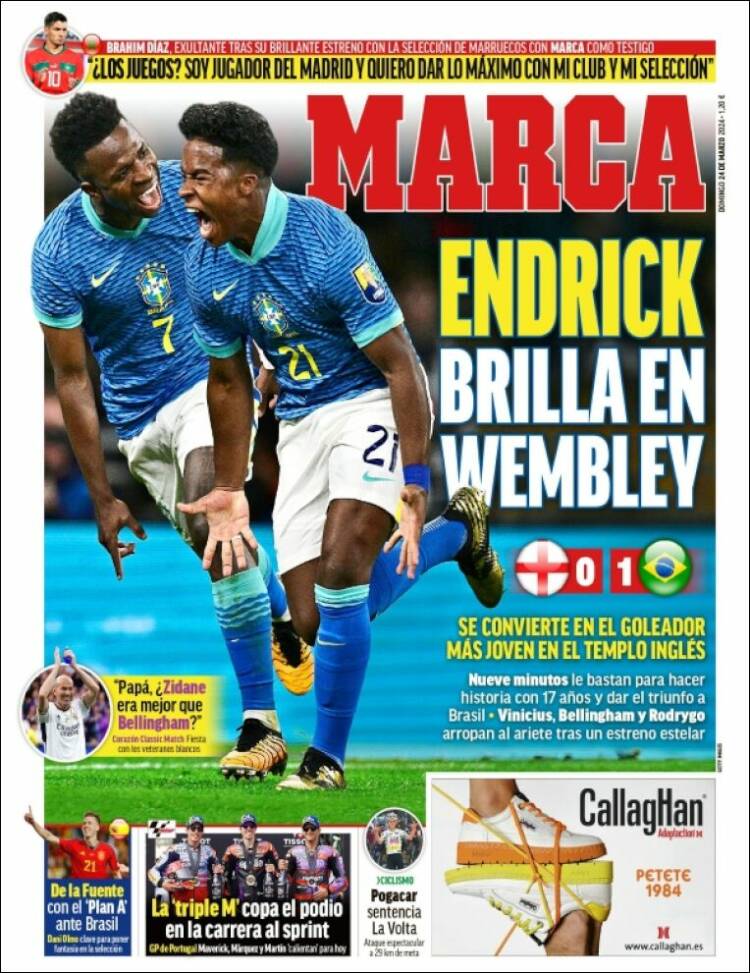 La selección brasileña de fútbol derrotó anoche a los locales en Wembley con gol de Endrick y el diario madrileño lo destaca en su portada con el verbo “brilla”. Remarca el hecho de que anotara el gol de la victoria con 17 años y se convirtiera en “el goleador más joven en el templo inglés”, mas en el Real Madrid las estrellas se cuecen a fuego lento y preferimos dejar los halagos excesivos para otras latitudes más necesitadas de ellos. El brasileño cuajó una buena actuación y pudo anotar un segundo gol, pero lo más noticiable para nosotros fue el buen rollo que transmitieron entre Jude Bellingham y el trío de “brasucas” Vini, Rodrygo y Endrick.