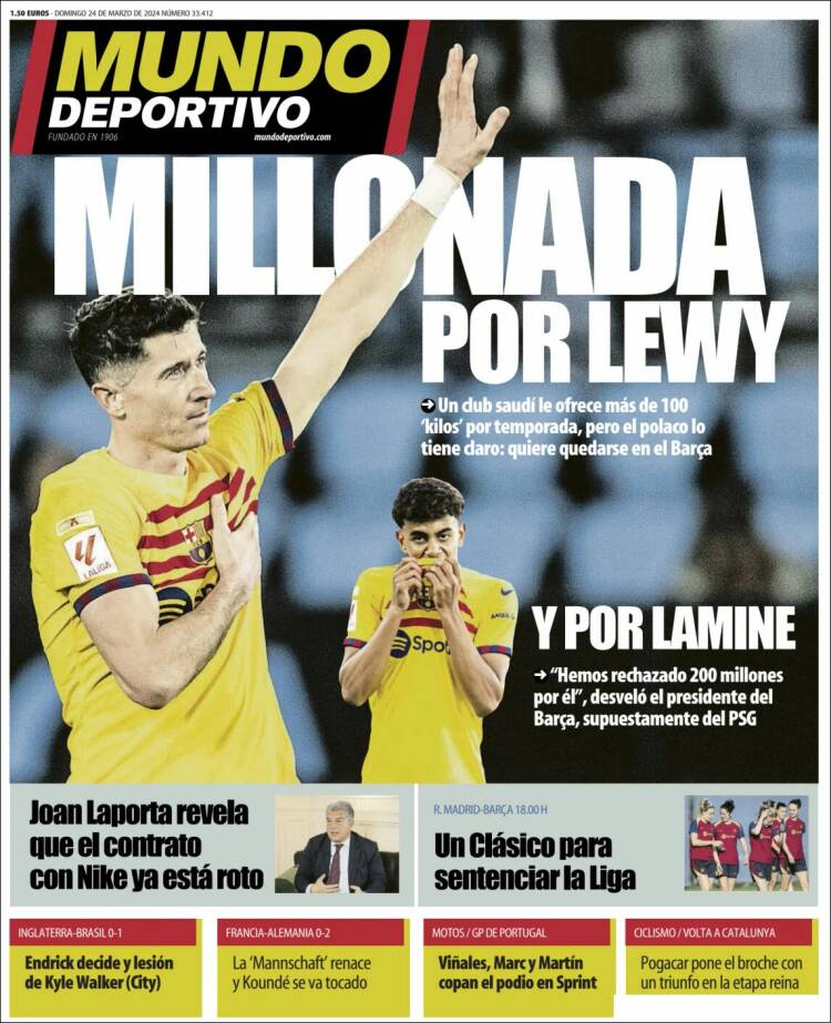 Los gestos son importantes. Joan Laporta afirma haber rechazado una oferta de 200 millones por Lamine Yamal y el joven, en la foto, parece contenerse la risa, sabedor, quizás, de que su contrato termina en 2025. De Lewandowski nos cuentan que rechaza 100 millones por temporada porque “el polaco quiere quedarse en el Barça”. Ya, y se lleva la mano al corazón, porque si de verdad hubiera esa oferta a su edad, se la llevaría a otras partes.