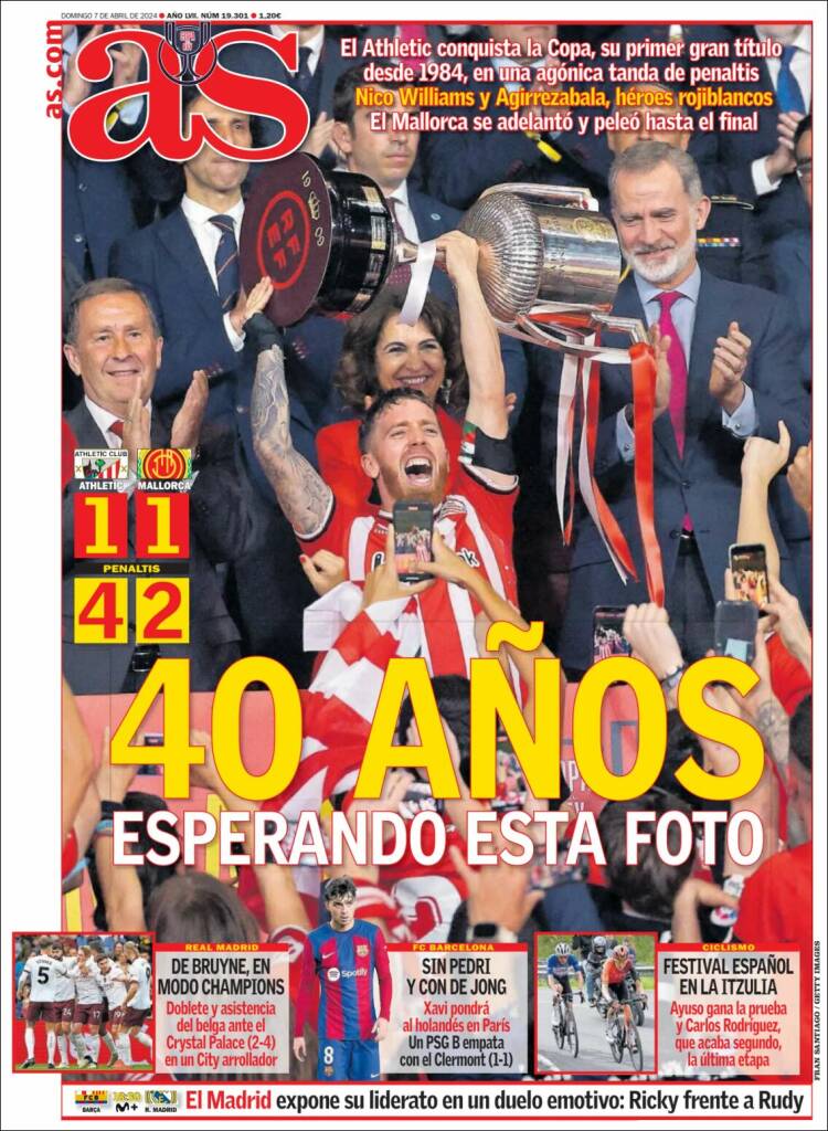 Buenos días, amigos. A estas horas ya sois sabedores de que la Copa del Rey ha ido a parar, cuarenta años después de la última, al Athletic Club de Bilbao. El equipo sabiamente entrenado por el Txingurri Valverde derrotó al Mallorca en los penaltis tras unos extenuantes 120 minutos con empate a un gol. Fue un encuentro de enorme tensión, con más energía que fútbol, que al final ganó desde el llamado punto fatídico quien más méritos hizo para ello. Por ocasiones y juego, comandados por el talento y la pujanza de Nico Williams, los vascos se hicieron merecedores del torneo.