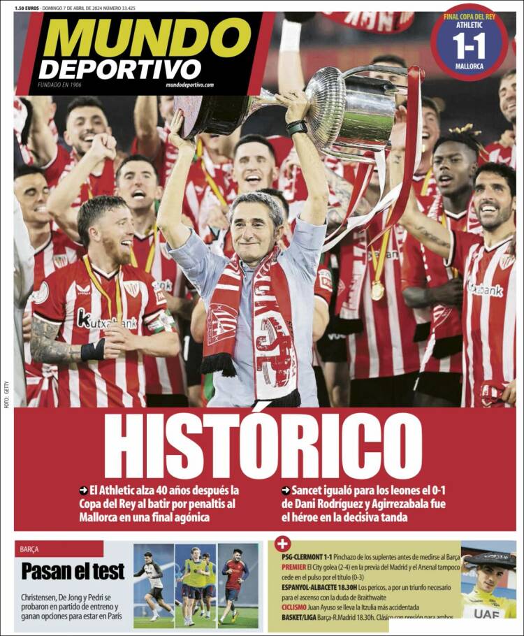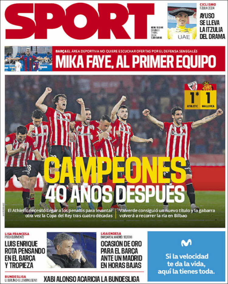 Como vais viendo en cada primera plana, todos los diarios felicitan a los bilbaínos y celebran la pronta salida de la gabarra. Sport, al igual que el resto, se hace cargo de un hecho extraordinario en el fútbol alemán: el Bayer Leverkusen de Xabi Alonso es campeón virtual de la Bundesliga, donde desde tiempos inmemoriales suele arrasar el Bayern de Múnich. Felicitamos -entendemos que ya se puede- a Xabi por la brillante hazaña, que le sitúa en la élite de los entrenadores del momento. Xabi será algún día, sin prisa, el entrenador del Real Madrid.