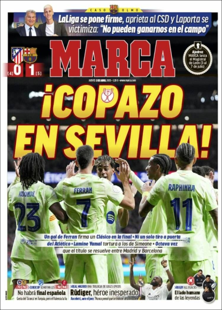 La prensa cataculé se muestra como veis ufana ante la perspectiva cierta de un nuevo mal llamado clásico, que esta vez además dirimirá de manera directa un título importante (más importante en todo caso que la Supercopa de España y Arabia). Fotos de euforia entre Fermín, Lamine y otros nombres en miniatura. Nos extraña que no hayan incluido en las fotos a Musso, verdadero protagonista del triunfo de ayer, segundo portero rojiblanco que a estas horas, según nos informan, aún no ha salido de su portería para tratar de atajar la incursión de Ferran. ¿Existe costumbre más lesiva para los resultados de los equipos que la concesión caritativa de poner al “portero de Copa” cuando tienes otro que es infinitamente mejor?