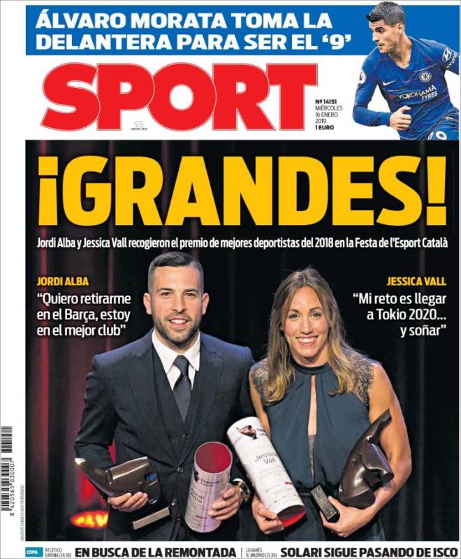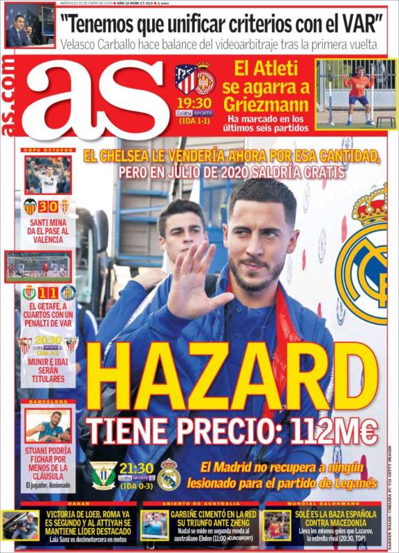 En el resto de portadas, Relaño rescata a Hazard cuando tocaba hablar del VAR y le dice a los culés que Stuani está muy ilusionado ante la idea de fichar por el Barcelona. Todo lo contrario a 'Sport', que apunta directamente a Morata. Alguno se equivoca. O los dos. Con la prensa española no se sabe. Por cierto, felicitamos a Jordi Alba por su más que merecido premio a mejor deportista de 2018. Mañana le entregarán a Juanfran el de mejor lanzador de penaltis.