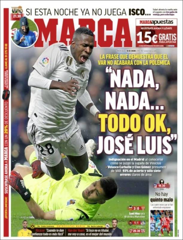 Sólo 'Marca' lleva en portada la hilarante charla. Agradecemos el detalle. El madridista de a pie, mientras tanto, se pregunta por qué nos quisieron mostrar ayer este diálogo cuando en él se ve que todo funciona atropelladamente y que el árbitro de turno parecía impaciente por dejar sin señalar los once metros. Nos imaginamos a José Luis apretando los dientes cuando le dicen "todo OK" desde el VAR. Suspirando, respirando hondo, como el que acaba de salvar un obstáculo importante. Y a Velasco Carballo y Clos Gómez, el día antes de la comparecencia de este martes, riéndose mientras observan el video con el que iban a incendiar al madridismo.