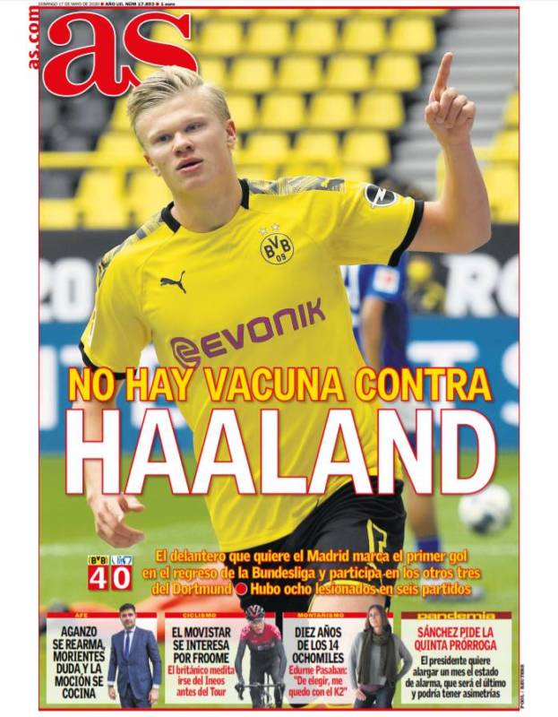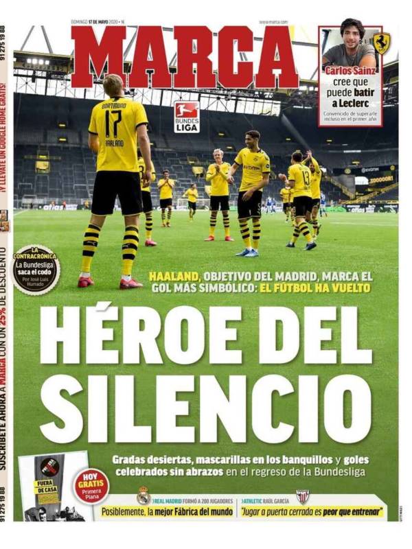 Haaland vuelve a ser hoy el protagonista de todas las fachadas, ocupando por completo la de As. “NO HAY VACUNA CONTRA HAALAND”, dice el sencillo y adecuado titular. Limpio, otro día más, de cochinadas, lo mismo que en Marca. Las mascarillas, las gradas vacías, la ausencia de abrazos. Toda esta ausencia, de entusiasmo e incluso de sensacionalismo, nos está sacando alguna lagrimita. El vacío de las gradas, la desvirtualización de todo, a pesar de los esfuerzos, nos tiene huecos, desanimados. Es extraña esta quietud. Toda esta novedad no deseada pero inevitable.