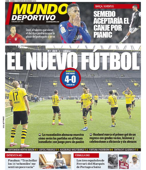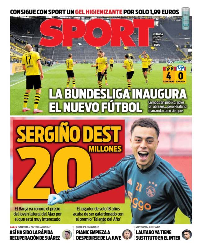 Buenos días. La Bundesliga se reinició ayer efectivamente, pero sin eco. Vamos a ver, con todo el eco posible, en realidad. Pero es como si no oyésemos nada. “El nuevo fútbol” lo llaman en Sport, donde barruntamos un nuevo rumbo. A Lautaro y a Pjanic ya los dan por empadronados, y puede que en la siguiente portada nos informen de las firmes intenciones de ambos de adquirir una masía en el Ampurdán, pero, mientras esto sucede, hace ya unos días que insisten en Sergiño Dest, cuya mejor cifra para Sport no son sus 18 años sino los 20 millones de su precio. Notamos ahí un volantazo en la política de fichajes. Es inútil que pongamos el brazo alrededor del papel para que no nos copien, al Madrid me refiero. El Barsa es un copiota, siempre lo ha sido y no nos vamos a asombrar ahora.