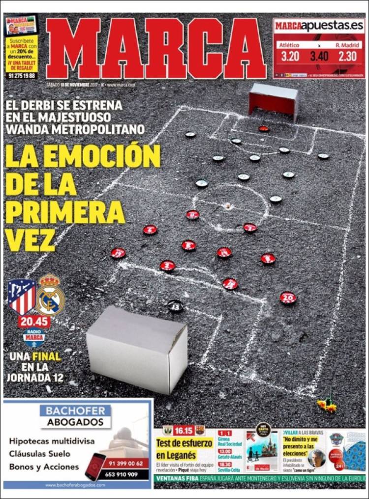 Hoy Marca (el periódico-que-dedicó-tres páginas-completas-a-entrevistar-al Presidente-del-Át(let)ico-y-no-le-hizo-ni-una-sola-pregunta-sobre-la-Operación-Soule) nos ofrece una MARAVILLOSA portada de patio de colegio, de calle, de libertad, de juego inocente, con ese punto de añoranza que nos lleva a una niñez sin móviles y sin Play, a jugar a las chapas, al fútbol y a destrozarnos las rodillas contra el suelo de piedrilla. Felicidades. Nos encanta. Disfruten de ella tanto como vamos a disfrutar de “La emoción de la primera vez”. Queremos estrenar el Wanda de nuestros vecinos del Atlético haciendo lo que mejor ha hecho el Real Madrid a lo largo de su historia: GANAR